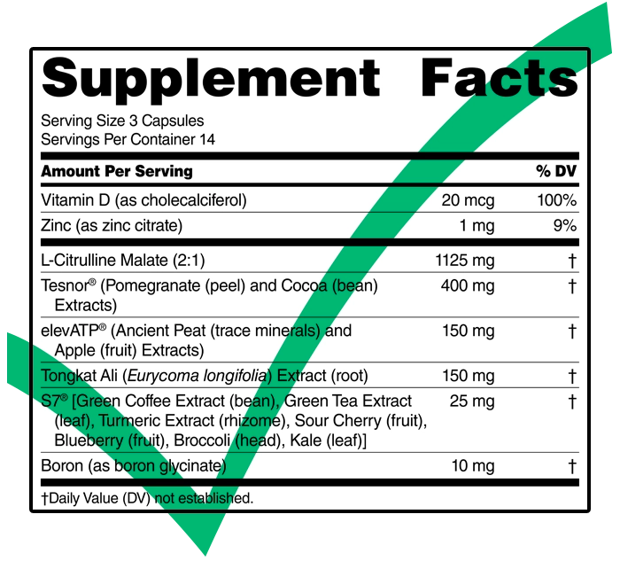 - Our unique formula contains a powerful blend of high-performance ingredients. Featuring clinically-validated amounts of Tesnor, elevATP, and boron.